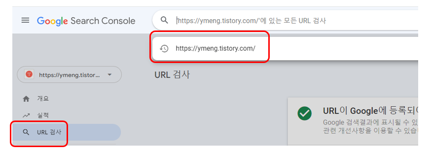 2. URL 검사를 선택 후, 본인의 티스토리 주소를 입력합니다.